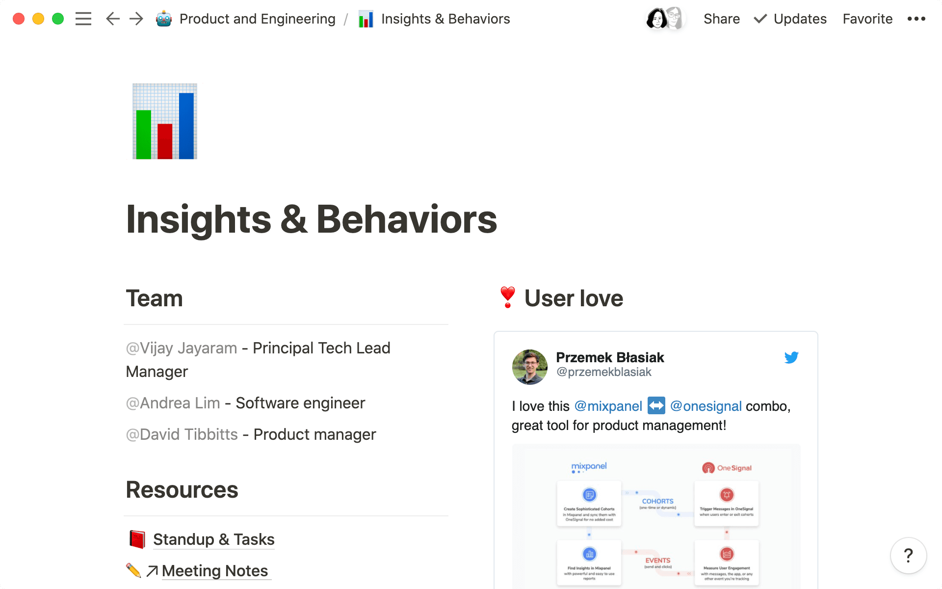 Vijay and his team save all meeting notes in Notion. Everyone is even more diligent and exhaustive in documenting their motivations, goals, and decisions. Instead of chasing down information in Slack, email, or fleeting conversations, the whole team can access a searchable record of meetings as they work through complex projects.