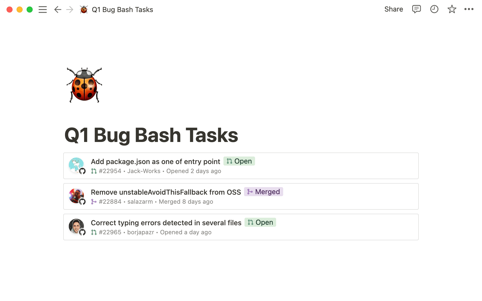 See up-to-date information from other tools, all inside your Notion workspace. Now when you paste a link from Jira, GitHub, Slack, Trello, and Asana, you can turn it into a dynamic preview โ€” either as an inline mention or as its own block. We'll be adding support for many more tools soon; this is just the beginning!